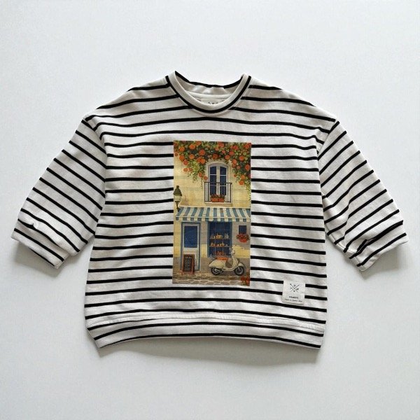 Buzo oversize unisex confeccionado en rústico de verano rayado estampado con estampa central con motivo de patiserie francesa.