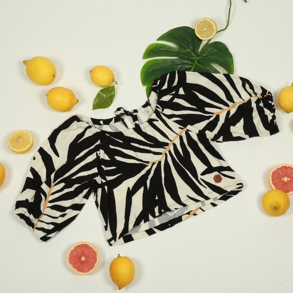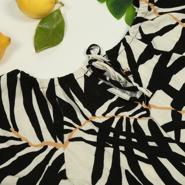 Camisola Corta con Mangas 3/4 confeccionada en lino con espandex, estampa de hojas negras con dorado. Una prenda con mucha frescura, ideal para armar conjunto con el pantalón long y armar un look completamente canchero, cómodo y con todo el estilo.