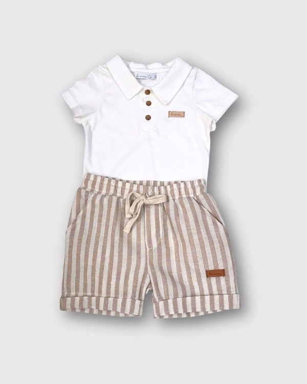 El Conjunto Estanislao es la opción perfecta para un look casual, cómodo, divertido y con mucho estilo. Compuesto por un body blanco confeccionado en suave jersey y con una bermuda de lino y diseño de rayas beige , este conjunto es ideal para fiestas, bautismo o el día a día , ofreciendo la máxima suavidad y libertad de movimiento.