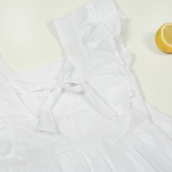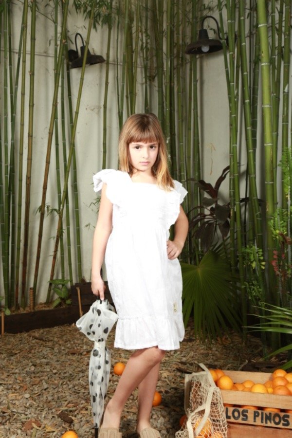 Vestido blanco sin mangas, con un diseño súper fresco y liviano. Detalle de bordados y vuelo en la parte inferior. Espalda descubierta para atar con un moño blanco y regular el ajuste a gusto de cada niña.